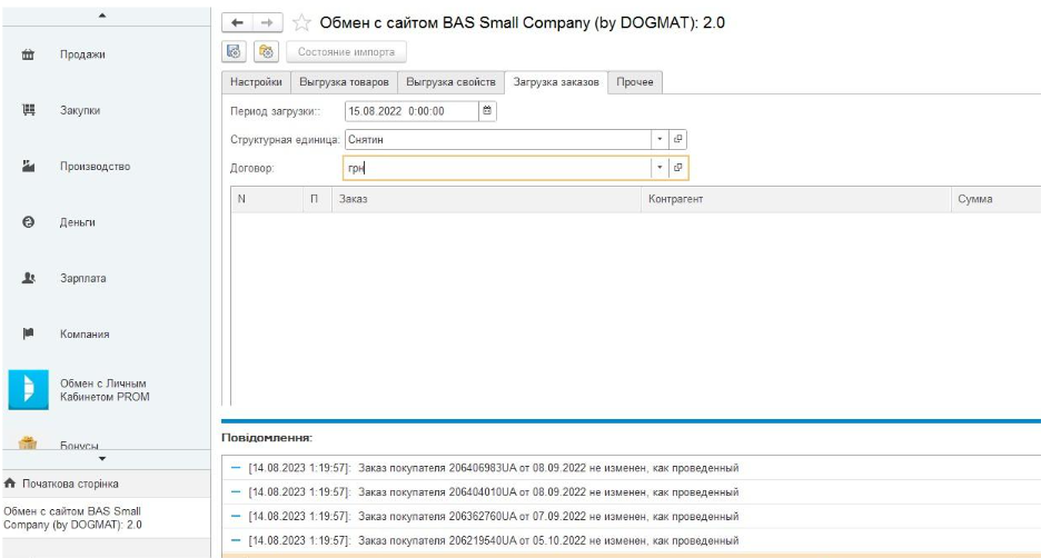 Обмін дозволяє завантажувати Замовлення покупців з порталу Prom.ua на дату, вказану в налаштуваннях відповідної вкладки “Завантаження замовлень”. Є можливість вказувати значення структурної одиниці та договору, що заповнюються за замовчуванням у завантажуваних Замовленнях.