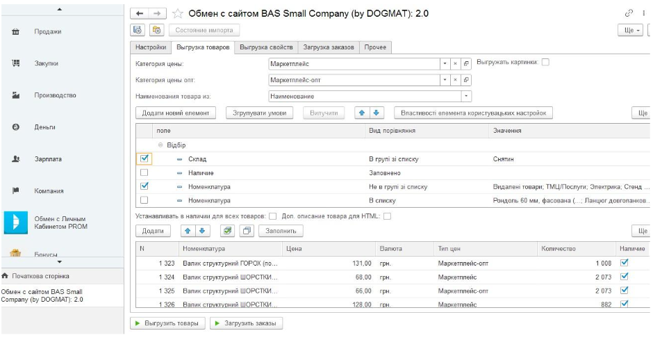 У рішенні є можливість налаштування різних відборів на вкладці “Вивантаження товарів”. Можна вказати роздрібну та оптову категорію цін. Наявність залишків розраховується за обраними структурними одиницями. Також є можливість вивантаження картинок і примусової установки ознаки наявності товару.
